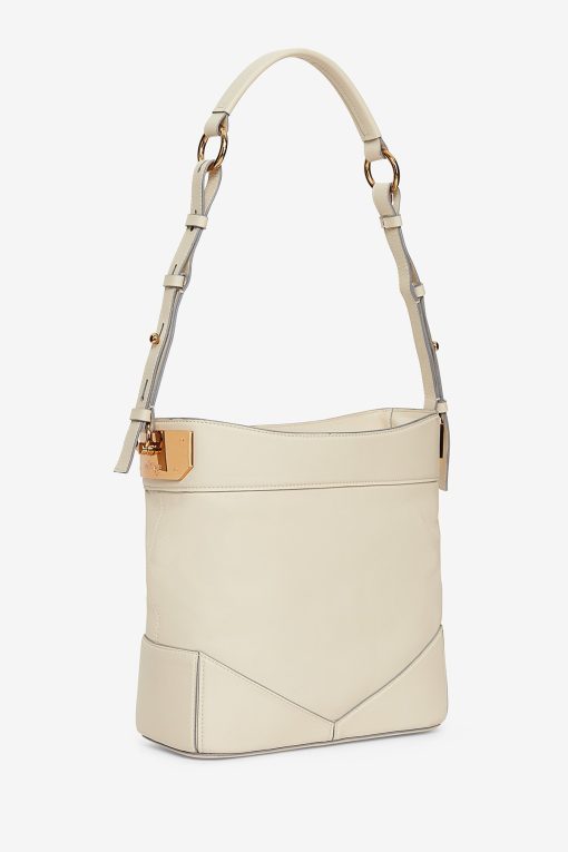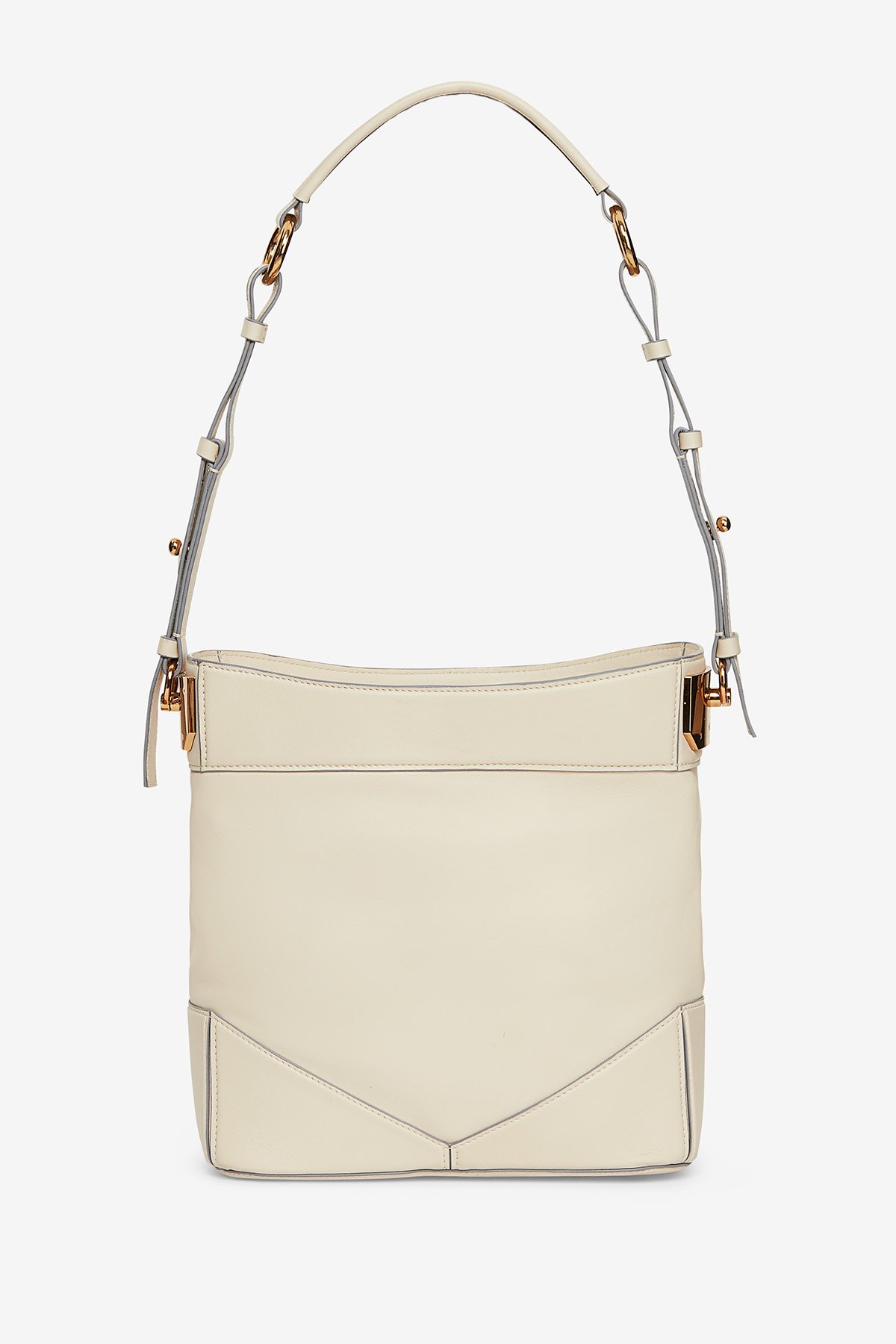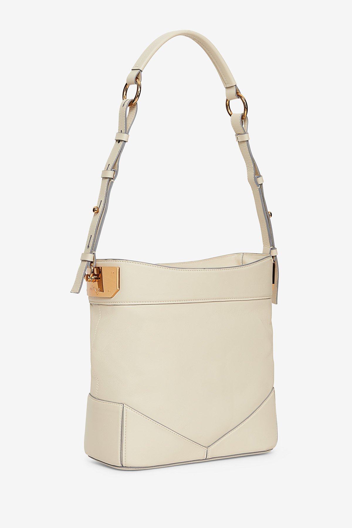 Leather bucket bag with adjustable shoulder strap. Interior with two compartments and side pocket with zip closure. Gold finish.Dimensions: 26.6x27x12 Length of shoulder strap: 33 cm