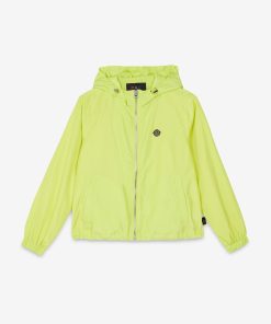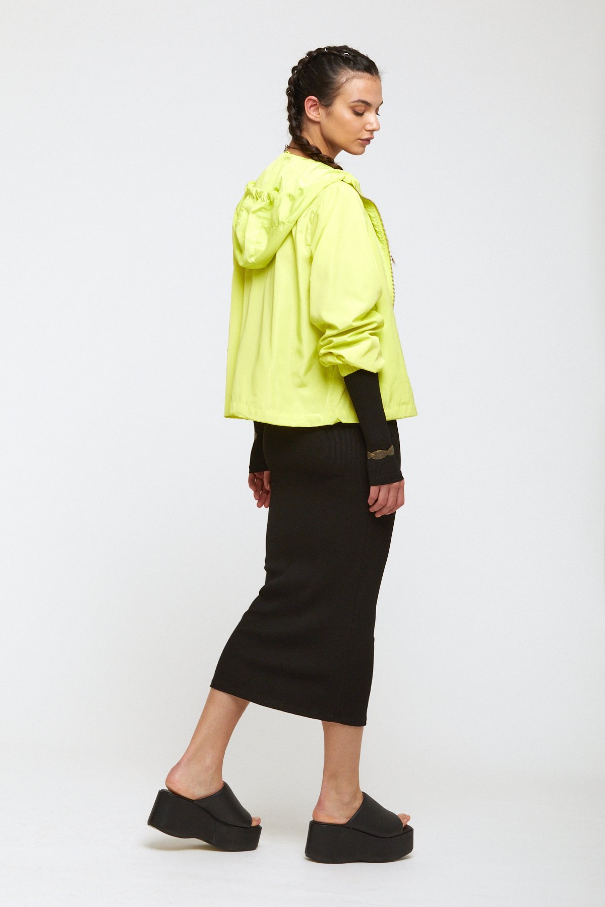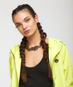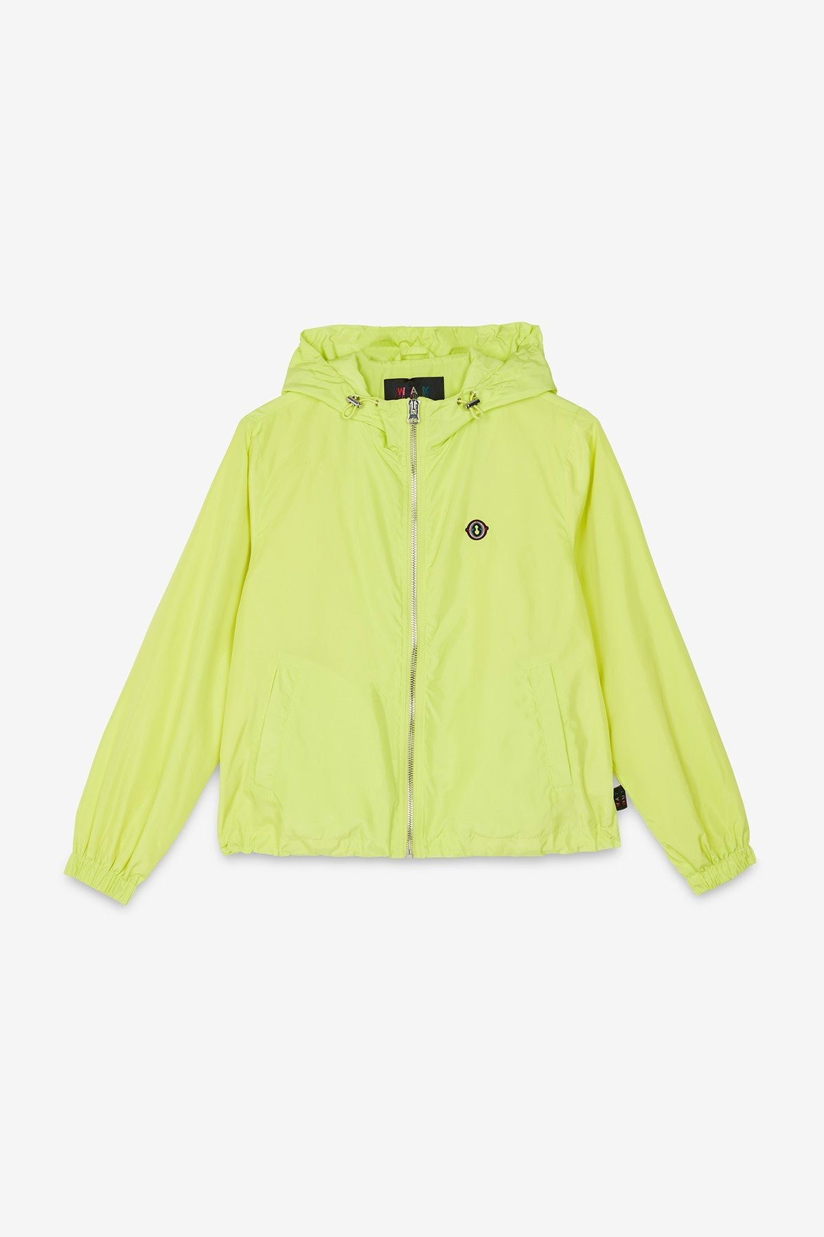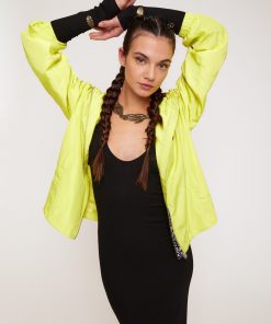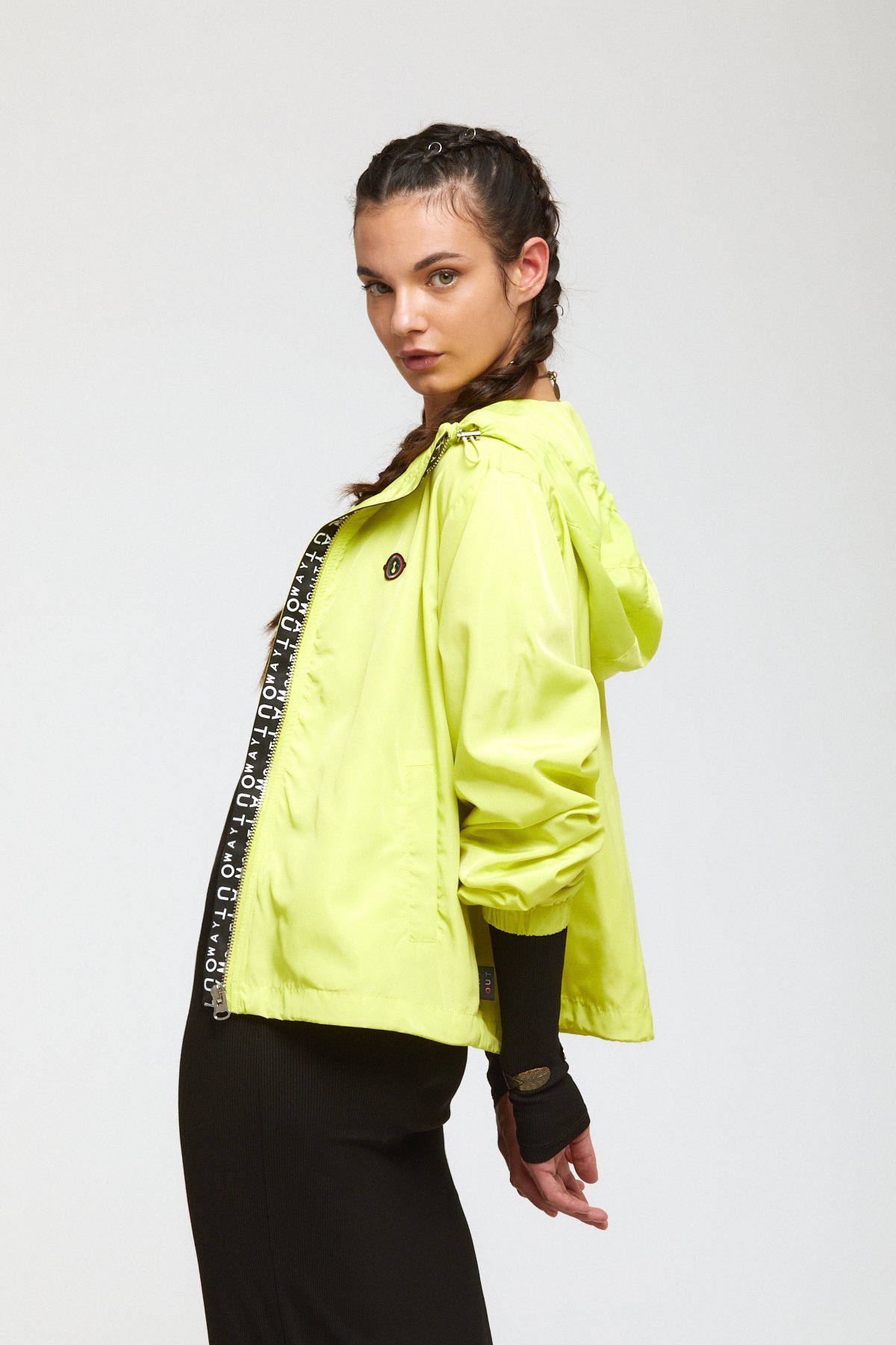 Down jacket with zipper andwith contrasting trims.