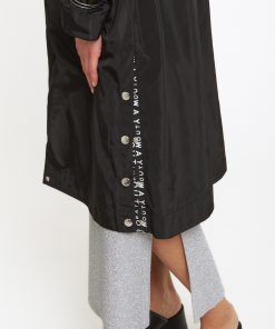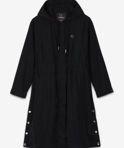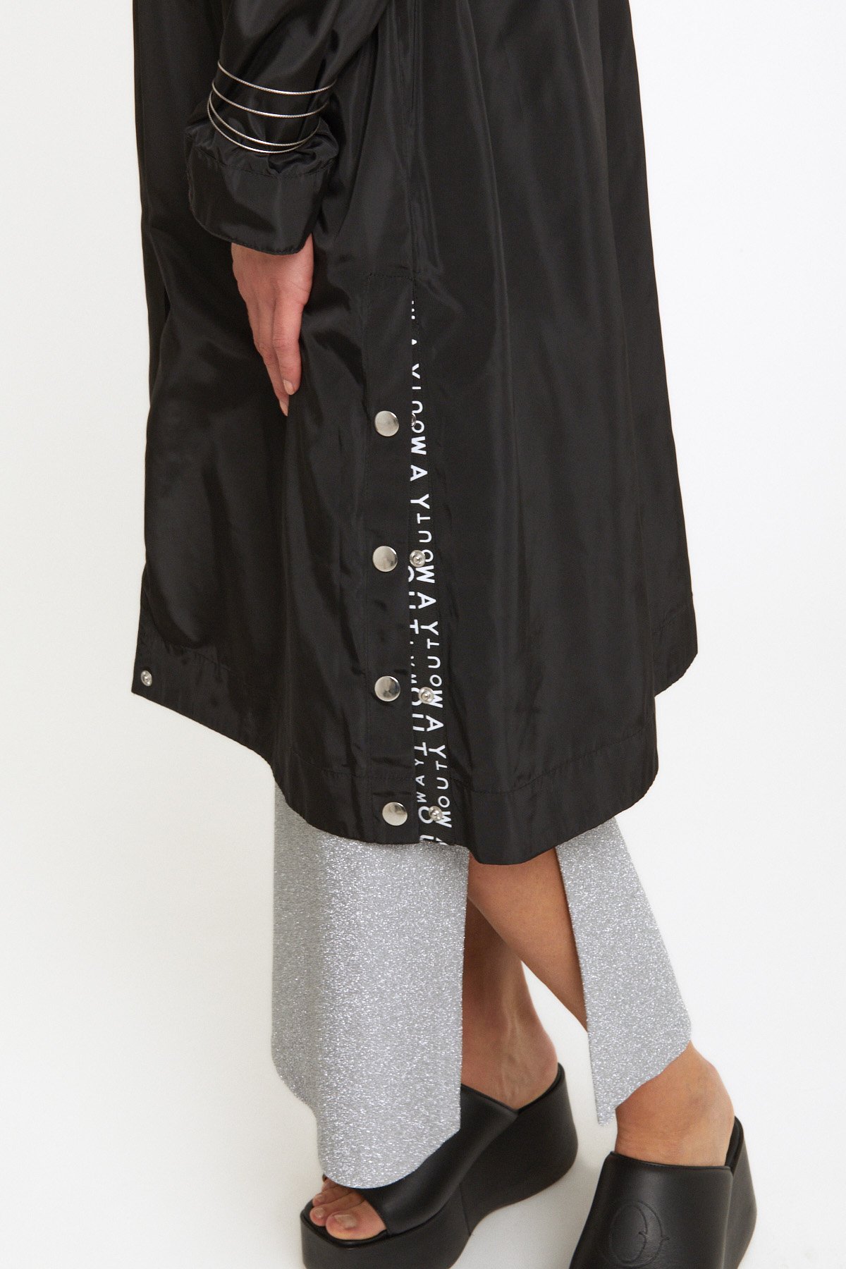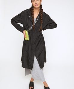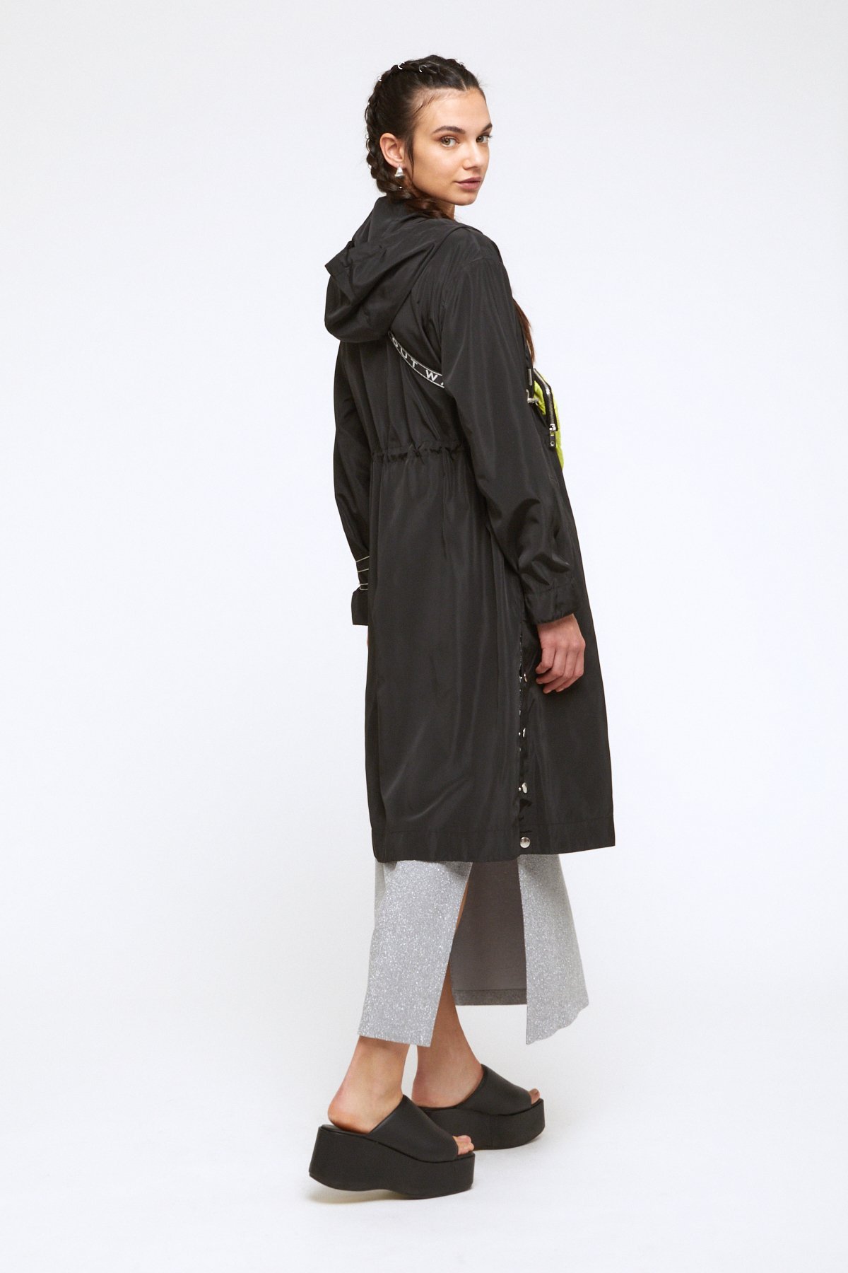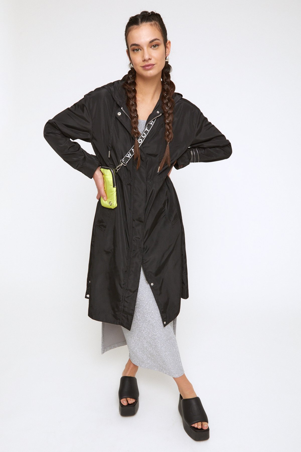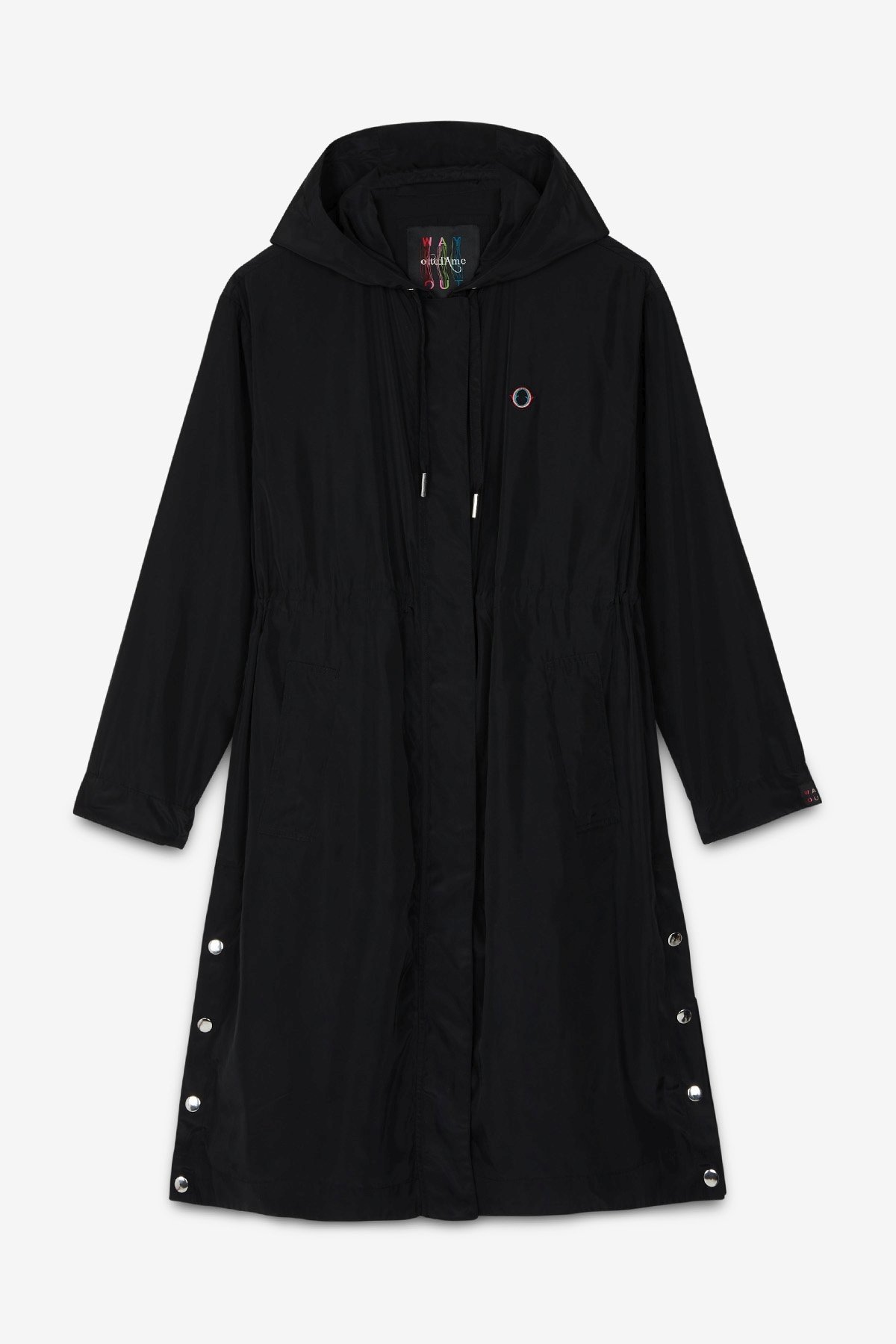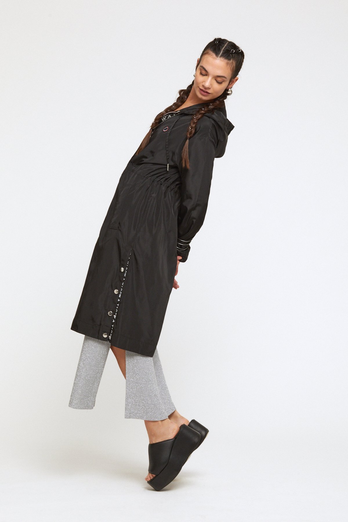 Midi trench coat with hood with drawstring and slits and buttons at the bottom.